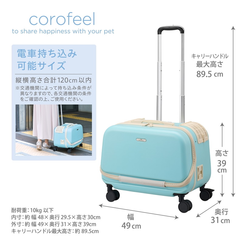 荷物が多い時でも快適にお出かけできます。 上に荷物を載せられ、片手で持ち上げられる手にやさしいソフトハンドルを装備。 エアダクト搭載しており、サイド扉から空気が通り抜け、通気性が抜群です。 大きなサイド扉付きなので、ペットと一緒に同じ景色を楽しむことができます。 サイド扉には扉ロック付き。 2段階に高さ調節が可能なキャリーハンドルを装備。 取り外し可能クッションが付属!カバーは外して洗濯可能。 内側ポケット付きで保冷剤やカイロを入れて温度調節も簡単です。 電車に持ち込み可能なサイズ。 ※交通機関によって持ち込み条件が異なりますので、各交通機関の条件をご確認の上、ご使用ください。