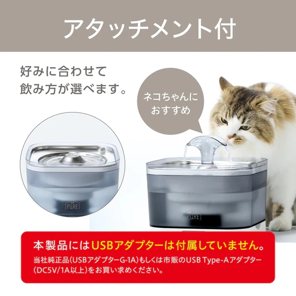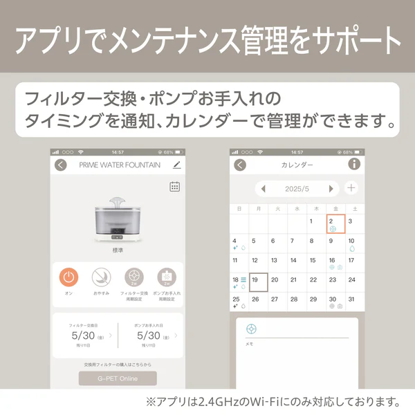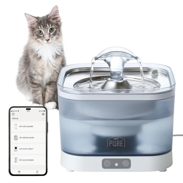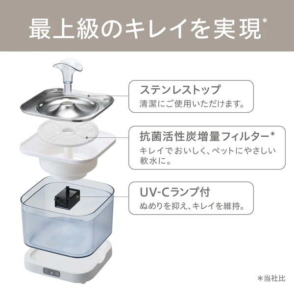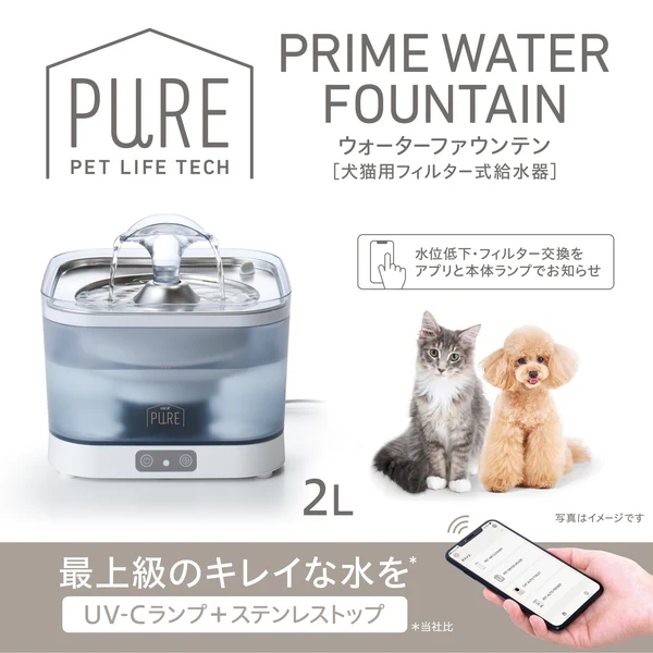 新鮮でキレイな水、アプリで見守り。 毎日をもっと安心・快適に! ■お手入れしやすいコードレス静音ポンプ&タンク ポンプ&タンクが独立しているので、コードを気にせず持ち運びでき、水換えやお手入れが簡単。 ■フィルター交換時期・水位低下を本体ランプ・アプリでお知らせ 忘れがちなフィルター交換をサポート。 ポンプは水位低下で自動停止する安全設計です。 ■ステンレストップ 清潔にご使用いただけます。 ■UV-Cランプ付 ぬめりを抑え、キレイを維持。 ■アタッチメント付 好みに合わせて飲み方が選べます。 ■アプリでメンテナンス管理をサポート フィルター交換・ポンプお手入れのタイミングを通知、カレンダーで管理ができます。 ■おやすみモード搭載 アプリで操作可能。間欠運転に変更できます。 ■専用フィルター「PRIME FILTERプライムフィルター」 ・たっぷり配合した抗菌活性炭がキレイを維持、カルキ臭を吸着しおいしい水に。 ・下部尿路の健康維持に配慮し、マグネシウム・カルシウムを除去して軟水にします。 ・ふわふわ繊維が食べカス・抜け毛などをしっかりからめ取ります。 ・1ヶ月に1回交換。