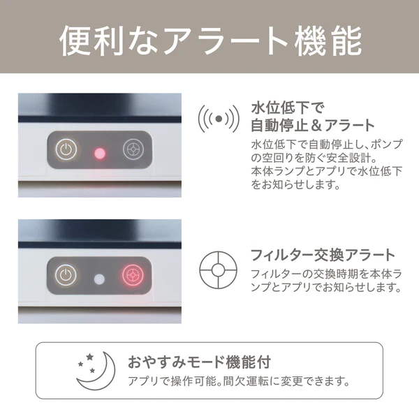 ■フィルター交換時期・水位低下を本体ランプ・アプリでお知らせ