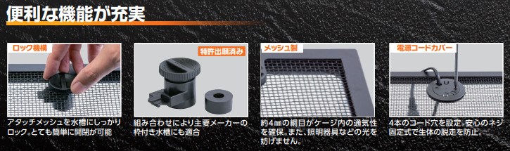 爬虫類・両生類・小動物の飼育に最適! 載せてロックするだけ!枠付き水槽が飼育ケージになる! エキゾチックアニマル用ケージネット。