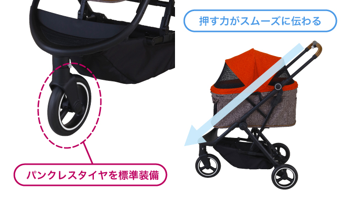 路面のガタ付きなど、走行時のキャリーに伝わる振動を和らげ、ペットのストレスを軽減します。