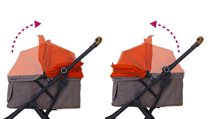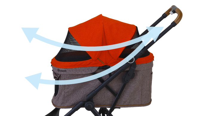 幌の前後とキャリー合計3ヵ所のメッシュ窓が風を通し、通気性抜群。