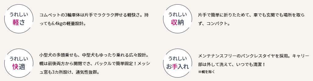 コムペットだからこその、こだわりが凝縮された3輪ペットカートです。