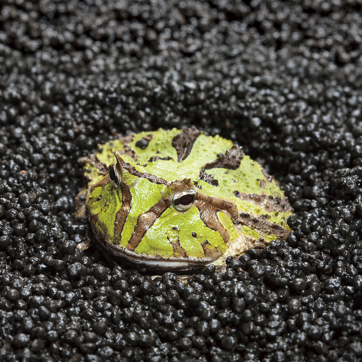 1.水中ではなく、湿った土や落ち葉の中に潜んで生活しているベルツノガエルを代表とする半地中性・地表性のカエル用床材です。