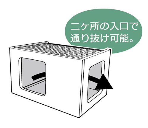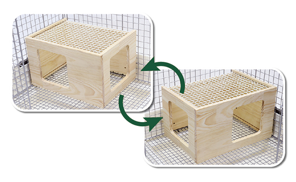 天面がメッシュタイプ。 2ヶ所の入口で通り抜け可能の木製ハウス。 隠れたり、高い場所を楽しんだり。 出入口が2ヶ所あるので、トンネルのように通過できます! 天井に乗ってオシッコしても、汚れは下へ落ちて衛生的。
