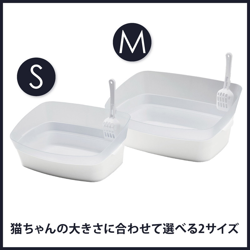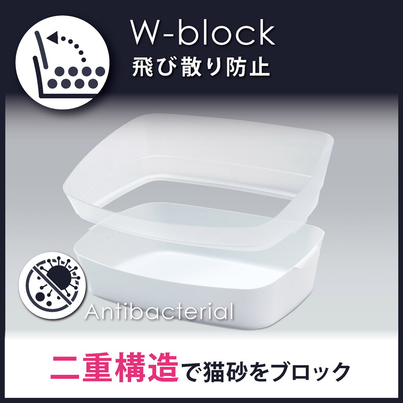 お部屋に置きやすい、クールでスタイリッシュな猫用トイレです。 長期に渡って清潔にお使いいただける抗菌成分を配合。 凹凸がないのでお手入れも簡単です。 独自の二重構造で猫砂の飛び散りをブロックします。 キレイ好きな猫ちゃんに嬉しい足置き場付き。 足に猫砂を付けずにトイレができます。 壁に引っかけられる専用スコップ付属。
