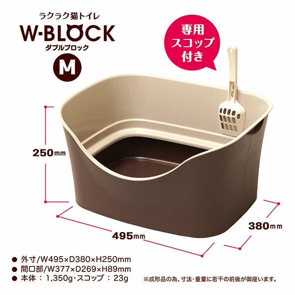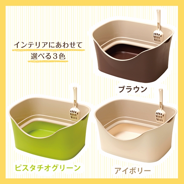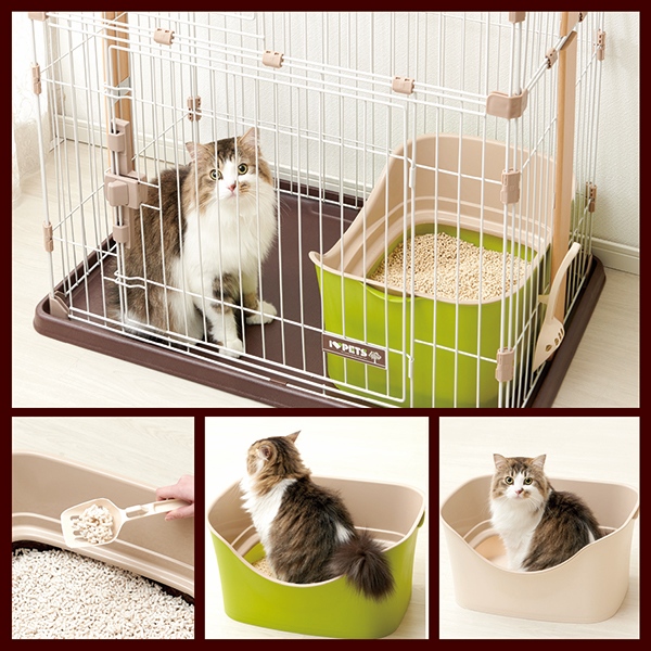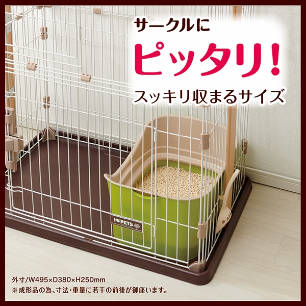 二重構造で猫砂をブロックします。大きめのネコちゃんに最適。 猫砂が飛び散りにくい安心設計!キレイ好きな猫ちゃんに嬉しい足置き場付き!足に猫砂を付けずにトイレができます。 横幅が495mm、奥行が380mmでサークル内にもスッキリ収まります。 壁部分に引っ掛けられる形状の、便利な専用スコップ。