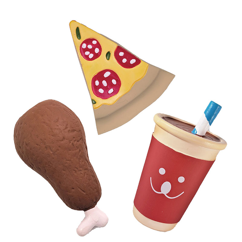 ファストフードの代表格、ピザ・チキン・ジュースをかわいい愛犬サイズに仕上げました。スクィーカーを鳴らしやすいやわらかラテックストーイです。