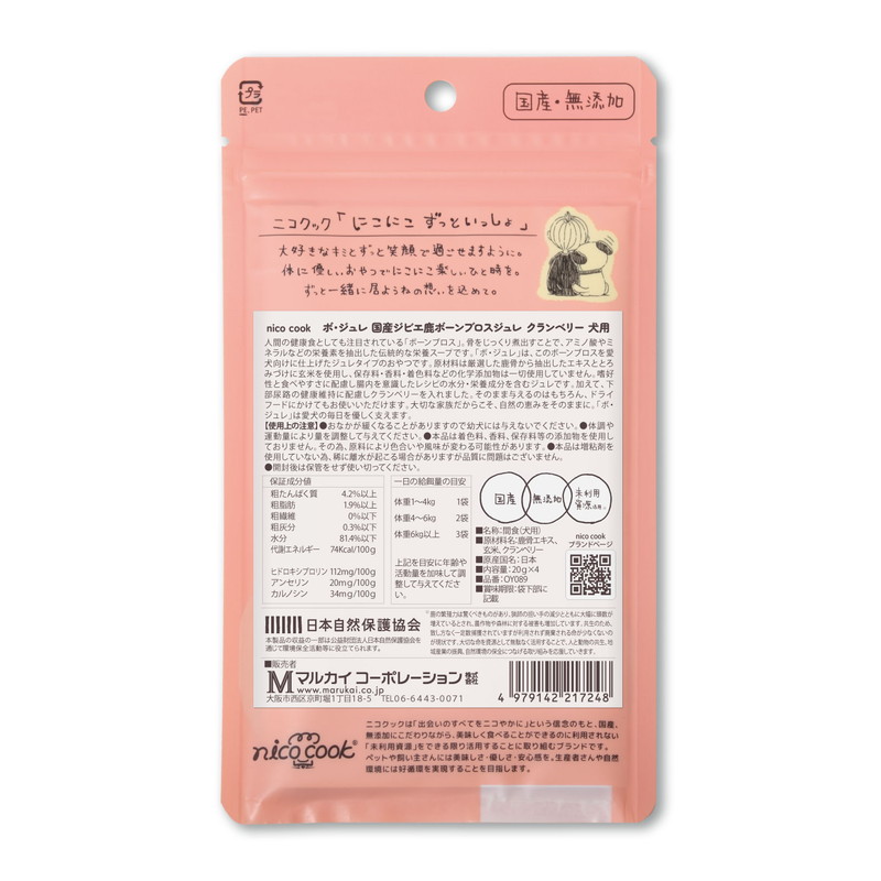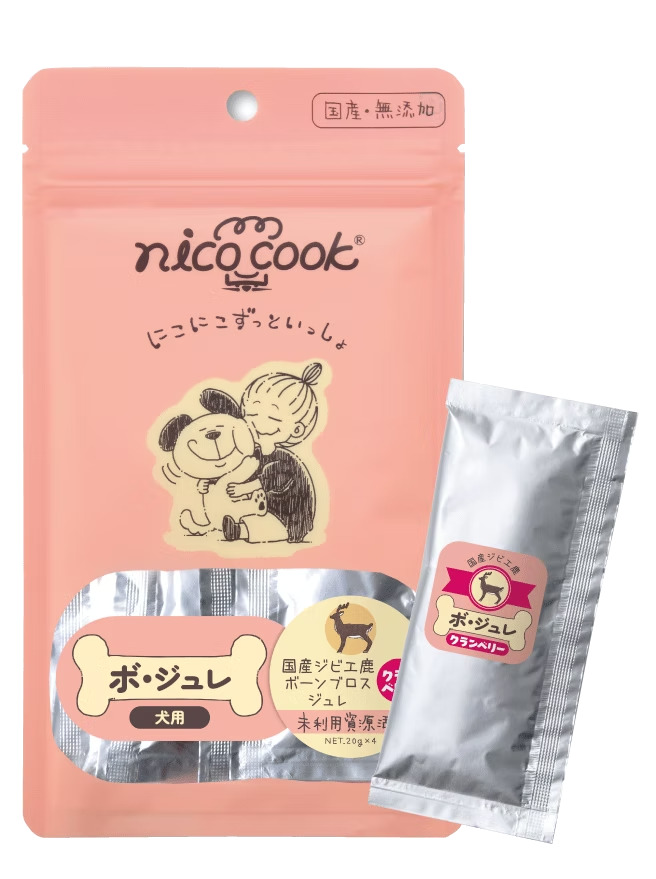 ボ・ジュレは、鹿骨から丁寧に抽出したボーンブロスを主原料にしたジュレタイプのおやつです。とろみづけに玄米を使用し、保存料・香料・着色料などの化学添加物は一切不使用。食いつきや食べやすさに配慮しながら、腸内環境を意識したレシピで、水分と栄養を手軽に補えるジュレタイプに仕上げました。
