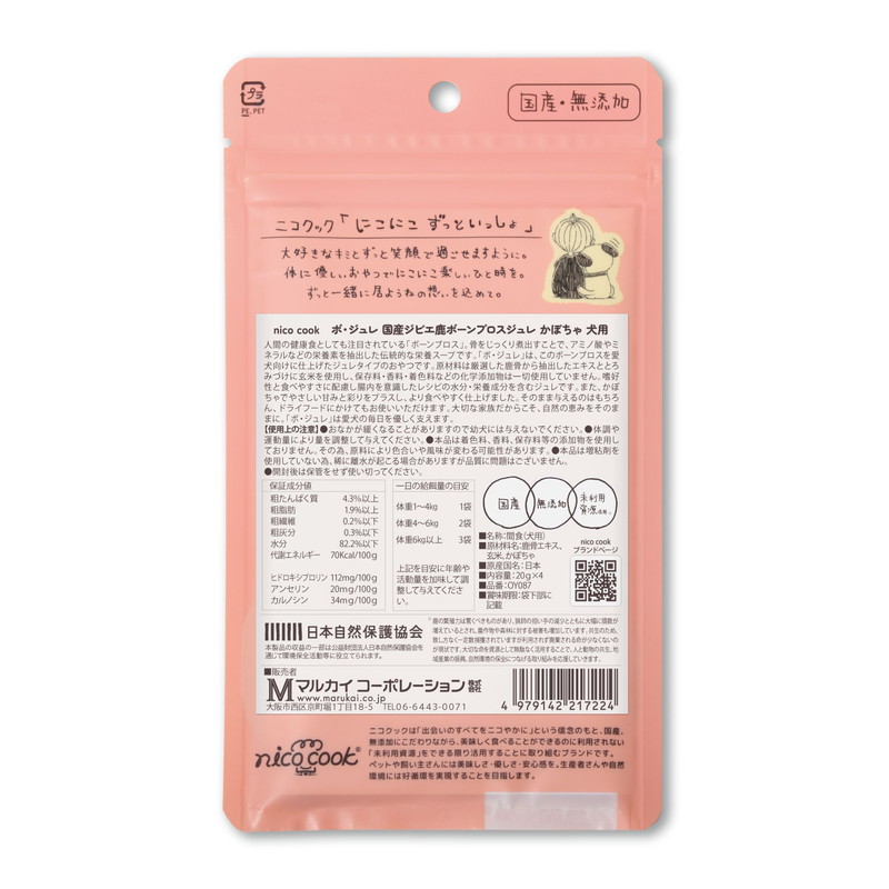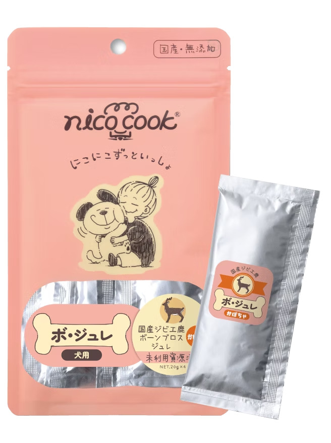 ボ・ジュレは、鹿骨から丁寧に抽出したボーンブロスを主原料にしたジュレタイプのおやつです。とろみづけに玄米を使用し、保存料・香料・着色料などの化学添加物は一切不使用。食いつきや食べやすさに配慮しながら、腸内環境を意識したレシピで、水分と栄養を手軽に補えるジュレタイプに仕上げました。