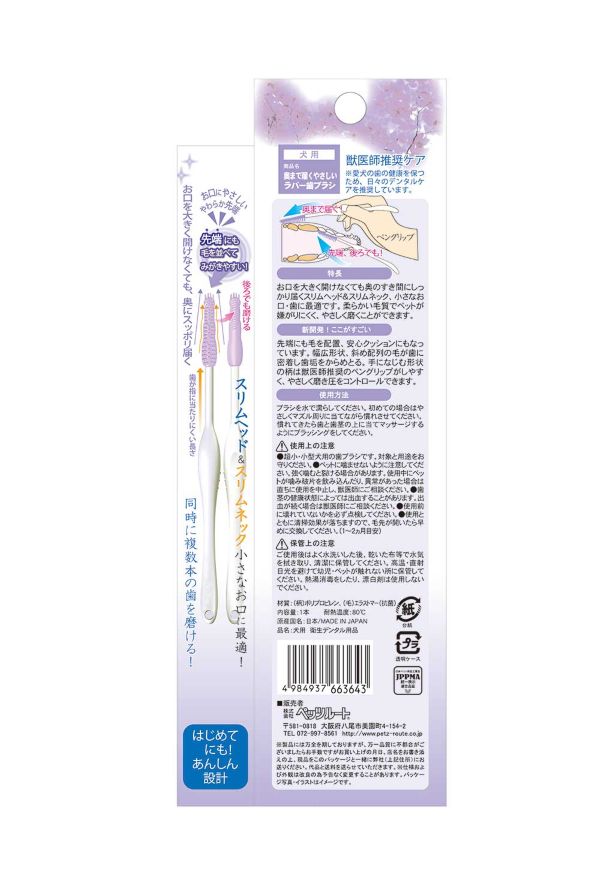 奥のすき間に入りやすいスリムヘッド&スリムネック、小さなお口・歯に最適です。ラバーの柔らかい毛質でペットが嫌がりにくく、やさしく磨くことができます。先端にも毛を配置、安心クッションにもなっています。幅広形状、斜め配列の毛が歯に密着し歯垢をからめとる。同時に複数本磨ける。3D形状の柄は獣医師推奨のペングリップがしやすく、やさしく磨き圧をコントロールできます。 【使用方法】 ブラシを水で濡らしてください。初めての場合はやさしくマズル周りに当てながら慣れさせてください。慣れてきたら歯と歯茎の上に当てマッサージするようにブラッシングをしてください。