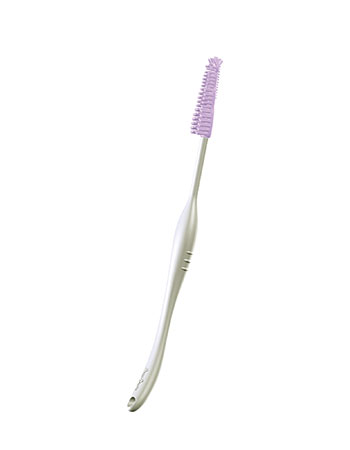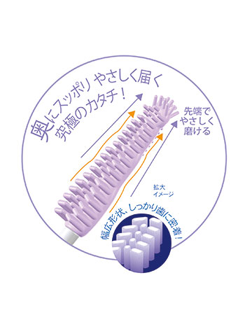 幅広形状、斜め配列の毛が歯に密着し歯垢をからめとる。