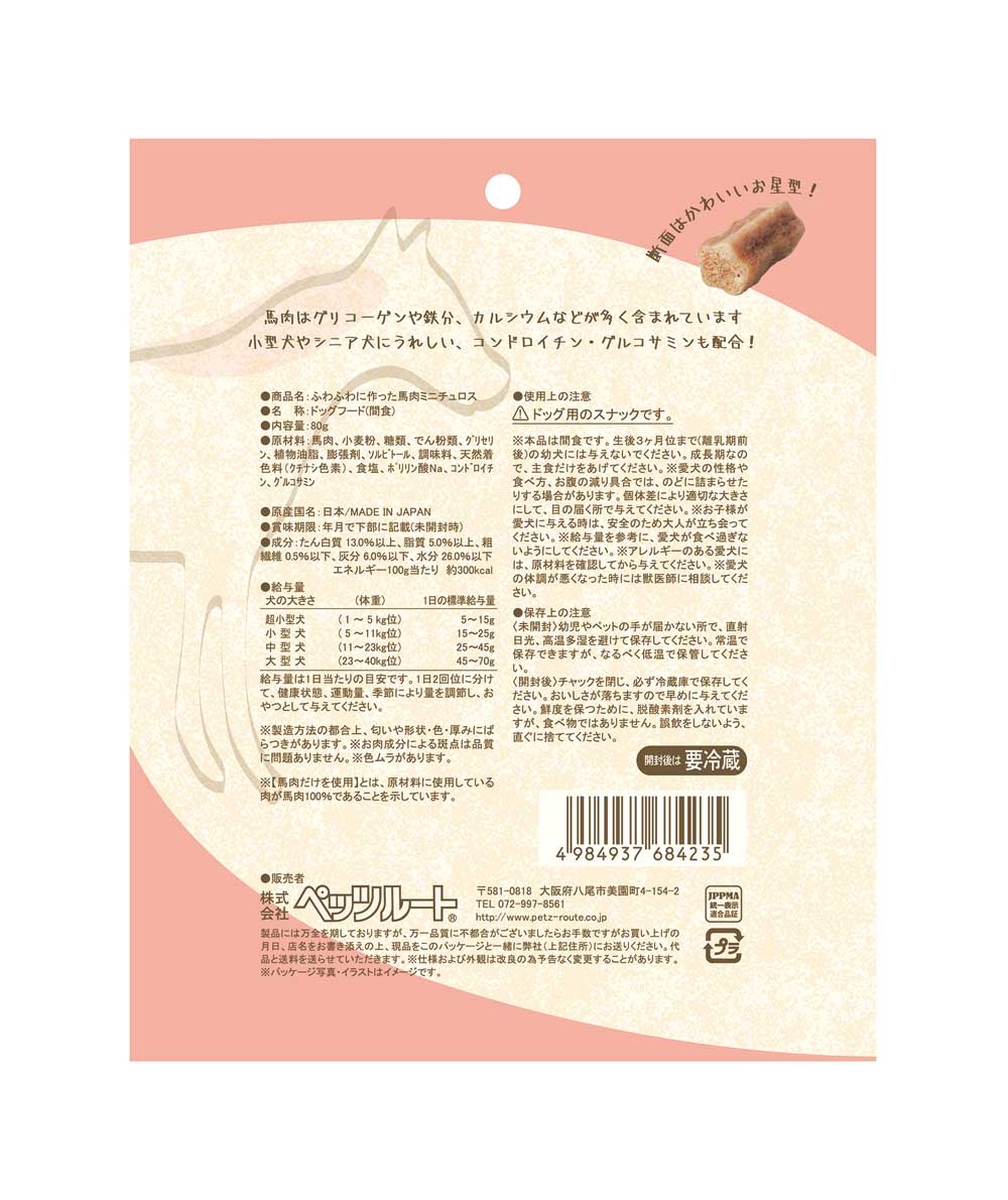 お肉は馬肉だけを使用。 ふんわりやわらかい食感にしました! 保存料・合成着色料・発色剤・酸化防止剤無添加。 馬肉にはグリコーゲンや鉄分、カルシウムなどが多く含まれており、小型犬やシニア犬にうれしいコンドロイチンとグルコサミンを配合しました! ●製造方法の都合上、匂いや形状・色・厚みにばらつきがあります。 ●お肉成分による斑点は品質に問題ありません。 ●色ムラがあります。 ●【馬肉だけを使用】とは、原材料に使用している肉が馬肉100%であることを示しています。
