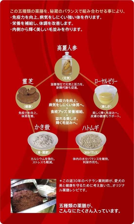 食べ物によって病気を予防する「医食同源」の考え方に基づき、ヘルシーな鹿肉に愛犬のための5種類の高級薬膳を配合しました。