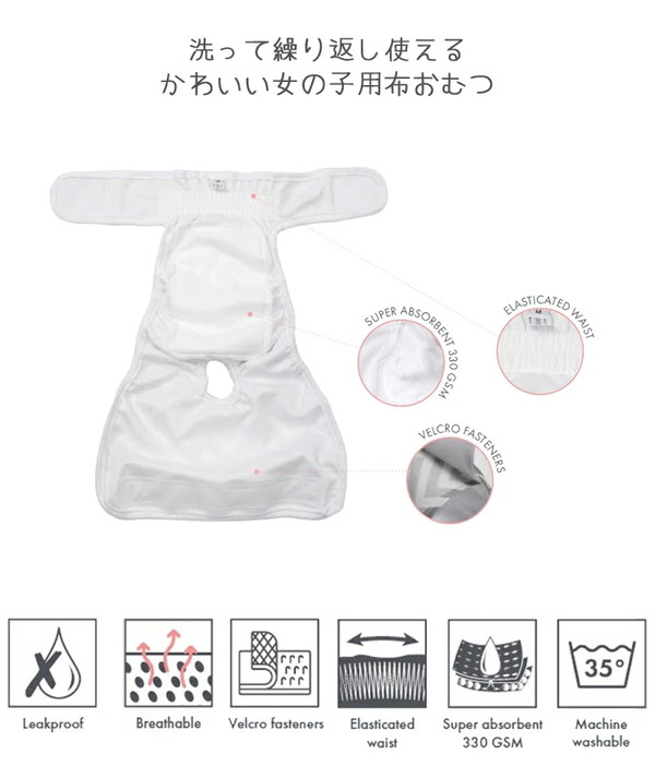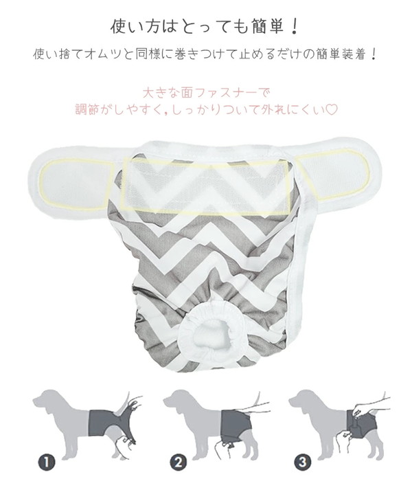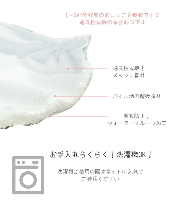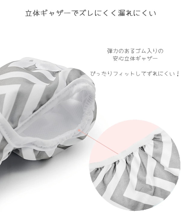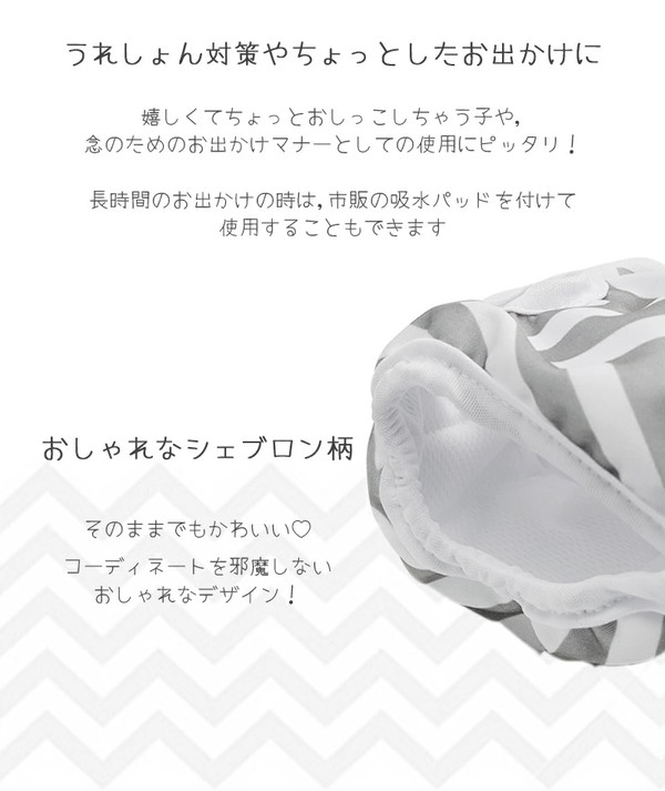 何度も洗って繰り返し使えてゴミが出ない、環境に優しいエコ商品。 お出かけ時のマナーとして、うれしょん対策にと、1枚あるととっても便利です。 おしっこ1~2回分程度(個体差あり)を吸水できる厚めのパッド付で、安心してお使いいただけます。 ★お手入れ簡単!洗濯機使用OK★ 毛羽立ちにくい素材で、繰り返し洗って使えるのでとっても便利! 幅広い面ファスナーで装着しやすい。 おしゃれなシェブロン柄でコーディネートを邪魔することなくお使いいただけます。