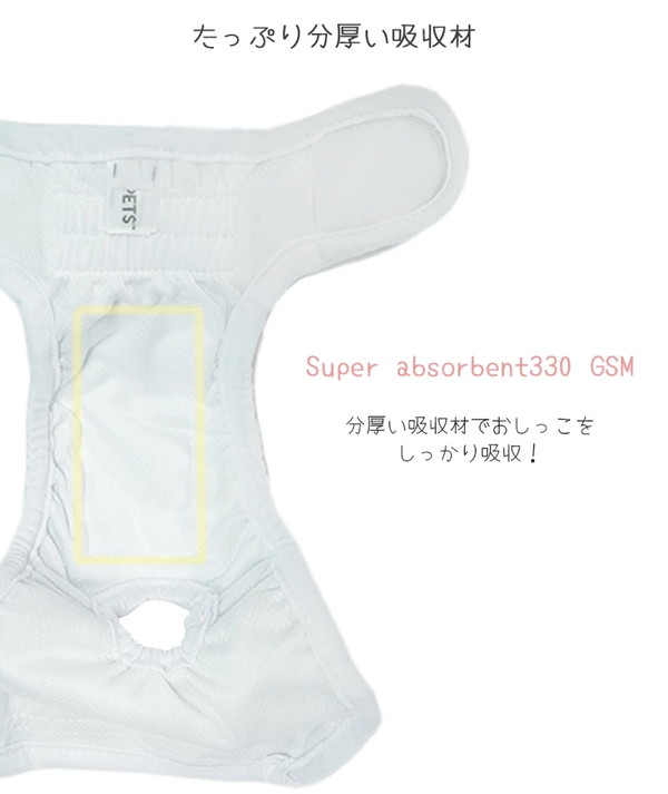 おしっこ1~2回分程度(個体差あり)を吸水できる厚めのパッド付で、安心してお使いいただけます。