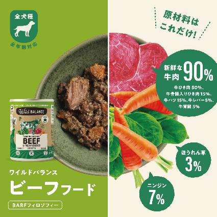 ペット専門のBARF(生食)専門店が作ったウェットフード。 お肉をたっぷり使い、100%ナチュラル・無添加にこだわり、生食の良さを一缶に詰め込みました。 フレッシュビーフに新鮮野菜を添えたウェットフードは、愛犬が喜ぶおいしい味わいです。 牛肉は栄養価が高く、風味も抜群です。 たんぱく質、ミネラル(鉄、亜鉛)、ビタミンB群が豊富です。