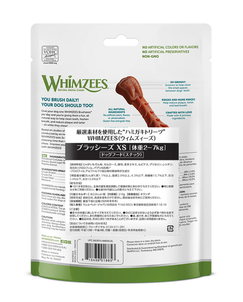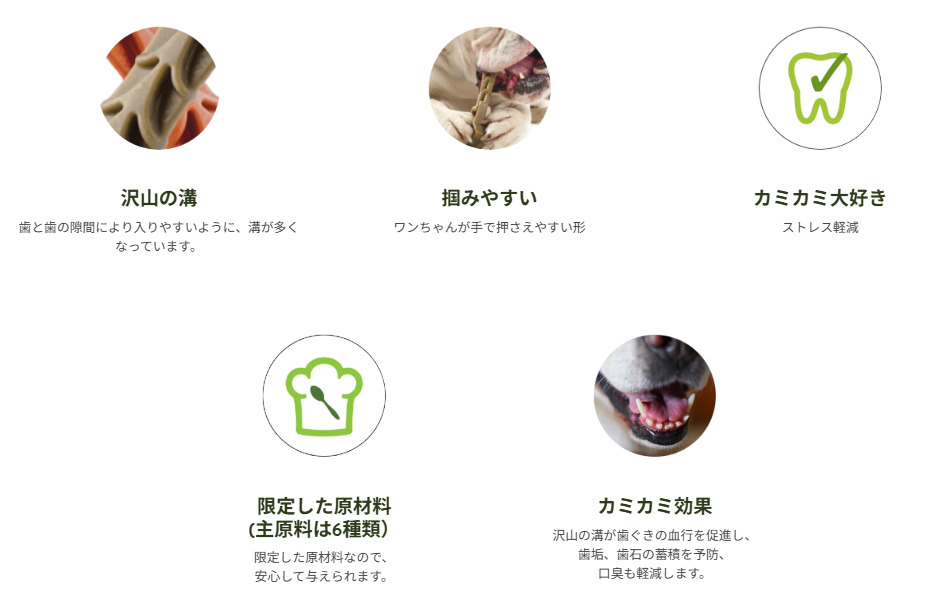 ・ウィムズィーズは、厳選された植物性の原材料だけで作られています(小麦・とうもろこしは使用していません)。 動物性の原材料は一切使用していませんので、アレルギー対策にもなります。 ・たくさんの溝が歯ぐきの血行を促進し、歯垢、歯石の蓄積を予防、口臭も軽減します。 ・たくさんの溝が歯と歯の隙間に入り込み、ハミガキ効果を高めます。 ・低脂肪でビタミンや抗酸化物質、そして消化を促進させるための食物繊維が豊富に含まれています。 ・人工的な着色料や香料は使用していません。厳選した植物性の原材料のみを使用。