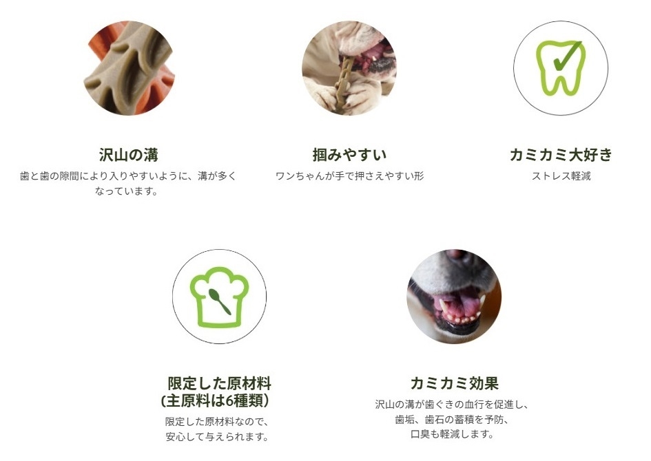 ・ウィムズィーズは、厳選された植物性の原材料だけで作られています(小麦・とうもろこしは使用していません)。 動物性の原材料は一切使用していませんので、アレルギー対策にもなります。 ・たくさんの溝が歯ぐきの血行を促進し、歯垢、歯石の蓄積を予防、口臭も軽減します。 ・たくさんの溝が歯と歯の隙間に入り込み、ハミガキ効果を高めます。 ・低脂肪でビタミンや抗酸化物質、そして消化を促進させるための食物繊維が豊富に含まれています。 ・人工的な着色料や香料は使用していません。厳選した植物性の原材料のみを使用。