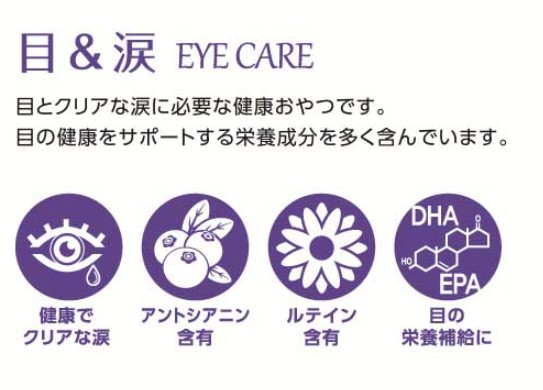 愛犬の健康ケアに必要な栄養成分を豊富に含んだ、高い嗜好性のおやつです便利な小袋タイプですので、愛犬の健康に1日1個を簡単に与えることができます【栄養成分】ルテイン+ゼアキサンチンルテインとゼアキサンチンは強力な抗酸化作用を持つカロテノイドという物質の種類です。目の網膜の保護や治癒に有益な色素成分です。ルテインは網膜を強力な光から保護したり、各種眼病から守ってくれる働きをしています。(ルテイン+ゼアキサンチン 37.5mg/kg以上含有)アントシアニンビルベリーはブルーベリーより4倍のアントシアニンを含んでいます。アントシアニンが目の構造を安定させ、非常に優れた抗酸化作用により目を保護します。(ビルベリー、ブルーベリーなどベリー粉末10,000mg/kg以上含有)オメガ3(DHA・EPA)目の網膜の脂肪には、大量のDHAが含まれています。DHAをしっかり摂ることで、網膜細胞がやわらかくなり、網膜の反射機能が高まります。ビタミンAビタミンAは角膜や網膜の細胞を正常に保ち、涙の量を一定に保つ働きを持っています。目の細胞には必須な成分です。【与え方】一日の給与量を目安にお与えください。愛犬の健康状態、便の状態、運動量、季節によって給与量を加減して、食べ過ぎないようにしてください。【成分表示】 粗たん白質 4.0%以上 粗脂肪 5.0%以上 粗繊維 3.0%以下 粗灰分 4.0%以下 カルシウム 0.01%以上 リン 0.01%以上 水分 14.0%以下 カロリー 約32kcal/1個【原材料】タピオカ、イソマルトオリゴ糖、グリセリン、酵母エキス、豚ゼラチン、人参粉末、亜麻仁粉末、ベリー濃縮粉末(アサイベリー、ブルーベリー、クランベリー、ブラックベリー、ラズベリー)増粘安定剤(CMC-Na)、乳化剤、フィッシュオイル、ビルベリー粉末、ルテイン、香料、キャラメル色素