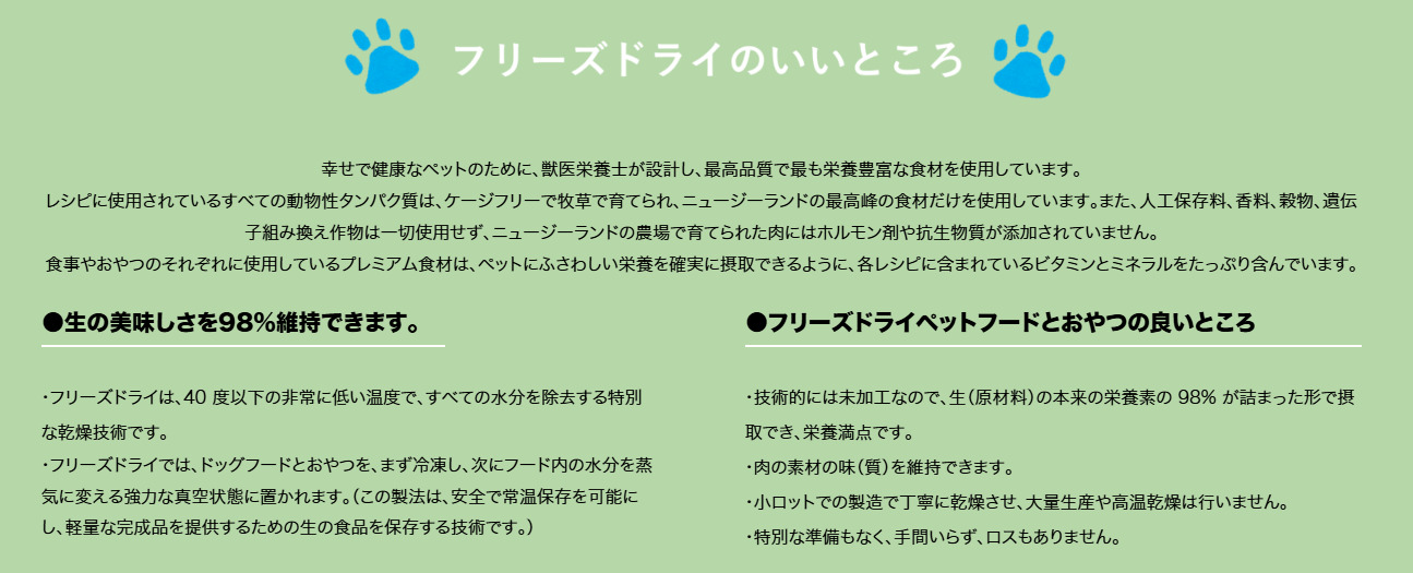 ニュージーランド産グラスフェッドビーフの使用している牛肉はすべてニュージーランド産の牧草飼育牛肉で、抗生物質やホルモン剤を含まず、ペットにとって美味しく栄養価の高い牛肉の食事です。